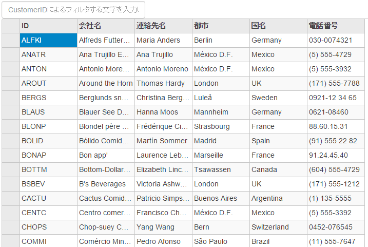 任意の文字を入力してグリッドデータをフィルタ処理します。たとえば、次の図はeAを入力したときのFlexGridです。