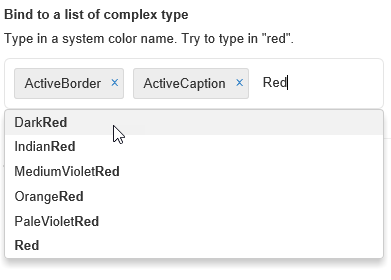 以下の例では、MultiAutoCompleteで、System.Drawing名前空間に含まれるKnownColor列挙を使用しています。KnownColor列挙には、システムによって認識されるすべてのシステムカラーのリストが含まれます。この列挙値にアクセスするには、NamedColorモデルを作成し、2つのプロパティ、NameとValueを定義します。これらのプロパティをViewコードで使用して、列挙値にアクセスします。