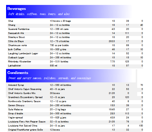 CategoryおよびProducts テーブルに基づいてマスター/詳細レポートを作成するには、Categories レポート(マスタービュー)と Products レポート(詳細ビュー)を作成する必要があります。