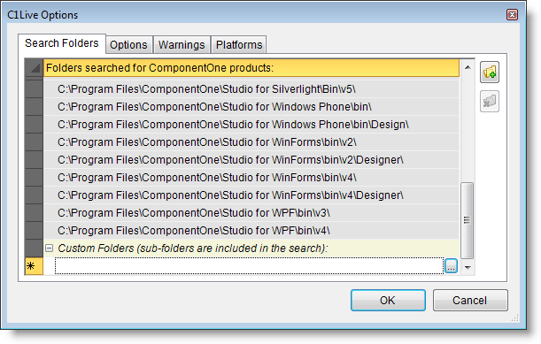 [フォルダの検索]タブには、Studio Live がインストール済みの ComponentOne 製品を検索する場所がリストされます。これらのディレクトリは、レジストリキー(灰色のエントリ)と、これまでにユーザーが追加したエントリから読み取られます。レジストリキーから検出される場所は、編集できません。ディレクトリリストに表示されないディレクトリに ComponentOne 開発ツールをインストールした場合は、以下の手順に従って、そのインストールディレクトリの \bin フォルダの場所を指定できます。