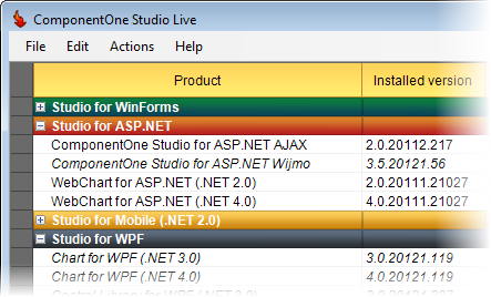 ComponentOne Studio Live は、ComponentOne コンポーネントを最新の状態に保つ作業を簡略化します。ComponentOne Studio Live は、ロードされると、ComponentOne の .dll ファイルの場所をレジストリで確認し、マシンからそれらのファイルを読み取ります。次に、ComponentOne WinForms、ASP.NET、Mobile、Silverlight、Windows Phone、WPF、iPhone、OLAP、または Entity Framework 製品(レガシー製品を含む)のリストを製品グリッドに表示します。