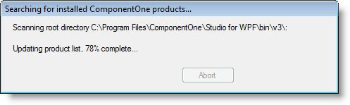 デフォルトでは、C1Live は C:\Program Files\ComponentOne\C1Live ディレクトリにインストールされます。Studio Live を別の場所にインストールした場合、この場所は異なります。最初にこのユーティリティを開くと、ファイルがスキャンされ、製品リストが更新されます。