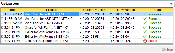 更新ログの詳細を表示するには、製品名の横にある[+]アイコンをクリックします。更新が失敗した場合は、その理由が詳細リストに記録されます。更新が成功した場合は、更新されたファイルと元のファイルのバックアップ先が詳細リストに記録されます。
