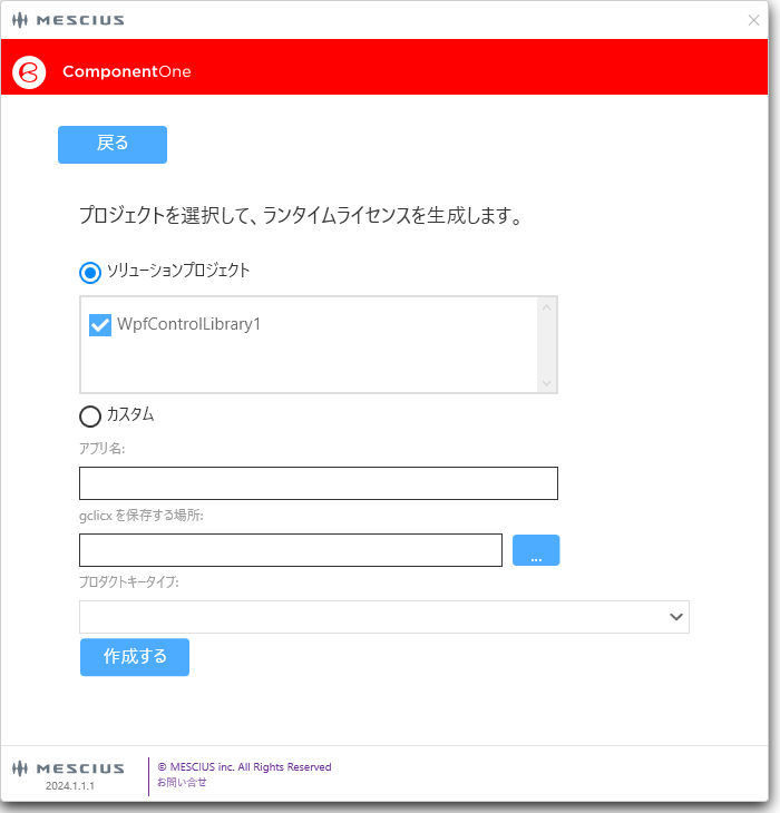 開発ライセンスが適切に認証された開発マシンまたはビルドマシンでアプリケーションをビルドすると、MESCIUS ランタイムライセンスファイル (.gclicx) が自動的に生成され、アプリケーションに埋め込まれます。通常は、埋め込みリソースとしてプロジェクトに追加されるか、ビルド時の一時ファイルとして obj フォルダ内に生成されます。