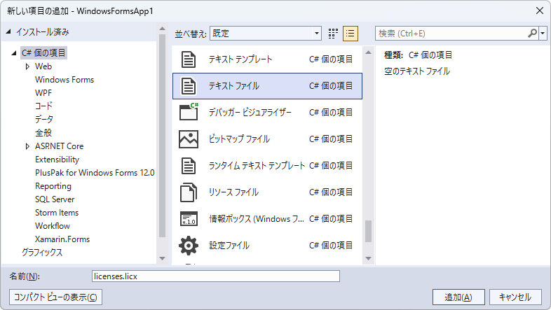 ダイアログにて「テキストファイル」を選択し、ファイル名を「licenses.licx」に変更して[追加]ボタンをクリックします。