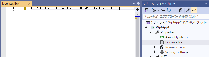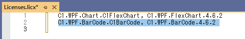 プロジェクトにさらにコンポーネントを追加し、それらのライセンスを手動で追加する場合は、既存のコード行の下に同じ形式で追加します。例えば、C1BarCode コンポーネントを追加で使用する場合は、以下のように追記します。