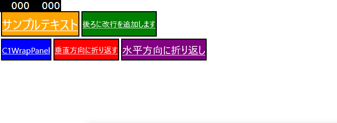 <Border Margin="2" BorderBrush="Black" BorderThickness="2" Background="Orange"> <HyperlinkButton Foreground="White" Content="サンプルテキスト" FontSize="25" /> </Border> <Border Margin="2" BorderBrush="Black" BorderThickness="2" Background="Green" Xaml:C1WrapPanel.BreakLine="After"> <HyperlinkButton Foreground="White" Content="後ろに改行を追加します" /> </Border> <Border Margin="2" BorderBrush="Black" BorderThickness="2" Background="Blue"> <HyperlinkButton Foreground="White" Content="C1WrapPanel" FontSize="16"/> </Border> <Border Margin="2" BorderBrush="Black" BorderThickness="2" Background="Red"> <HyperlinkButton Foreground="White" Content="UWP" /> </Border> <Border Margin="2" BorderBrush="Black" BorderThickness="2" Background="Purple"> <HyperlinkButton Foreground="White" Content="水平方向に折り返し" FontSize="20" /> </Border> |