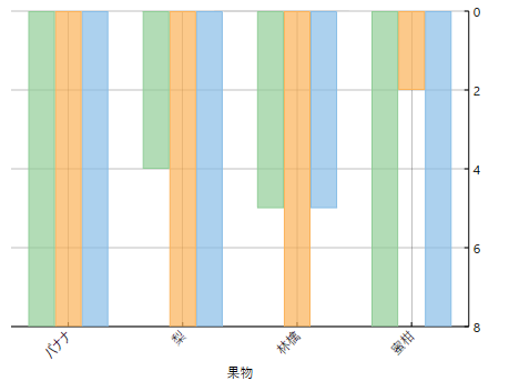 <Chart:C1FlexChart.AxisX> <Chart:Axis LabelAngle="45" Reversed="True" MajorGrid="True" MajorTickMarks="Inside" Title="果物" AxisLine="True" Position="Bottom"></Chart:Axis> </Chart:C1FlexChart.AxisX>