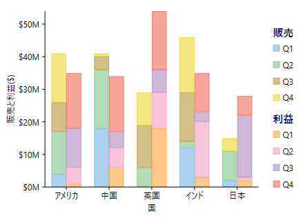 次の図に、ある企業の国ごと、四半期ごとの売上および利益をプロットする積層グラフを示します。ここでは、すばやく簡単に分析できるように、積み重ねられる系列に基づいて凡例項目をグループ化しました。この図は、凡例と凡例グループが縦方向に配置される様子と、グループタイトルの外観をカスタマイズできることも示しています。