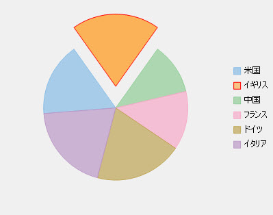 SelectionMode プロパティを Point に設定すると、SelectedItemPosition プロパティを設定することで、選択されている円グラフセグメントの位置を変更できます。また、選択されている円グラフセグメントを FlexPie の中心から離すことができます。それには、SelectedItemOffset プロパティを設定します。