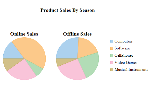 The following image shows two Pie Charts, Online Sales and Offline Sales for five different products. Computer, Software, CellPhones, Video Games and Musical Instruments.