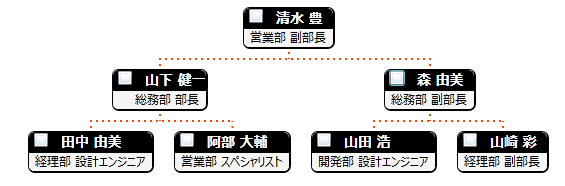 Orientation プロパティは、組織図のフローを垂直方向または水平方向のどちらにするかを指定できます。デフォルトでは、垂直の C1OrgChart が表示されます。Orientation プロパティを Horizontal に設定すると、次の図のようになります。