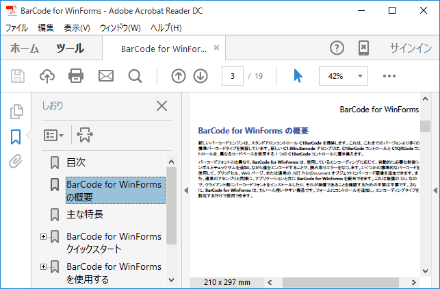 アウトラインエントリはブックマークと呼ばれ、C1PdfDocument.AddBookmark メソッドを使用することによって PDF for UWP ドキュメントに追加できます。C1PdfDocument.AddBookmark(String,Int32,Double) メソッドは3つのパラメータ(アウトラインエントリのタイトル、アウトラインレベル、およびページの先頭からのポイントで計測した現在のページ上のエントリの 'y' 位置)を受け取ります。