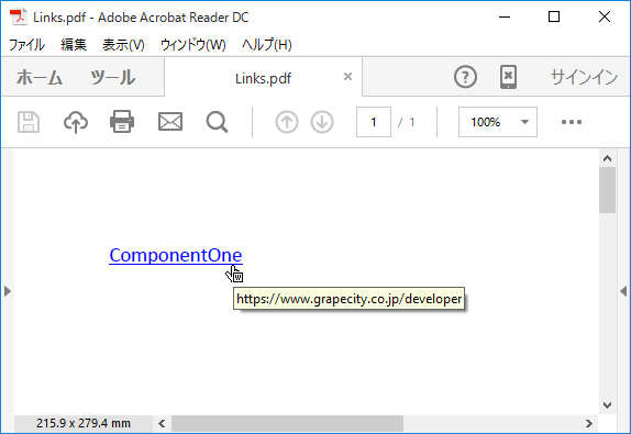 Rect rect = new Rect(50, 50, 100, 15); Font font = new Font("Arial", 10); pdf.AddLink("https://www.grapecity.co.jp/developer", rect); pdf.DrawString("ComponentOne", font, Windows.UI.Colors.Blue, rect); |