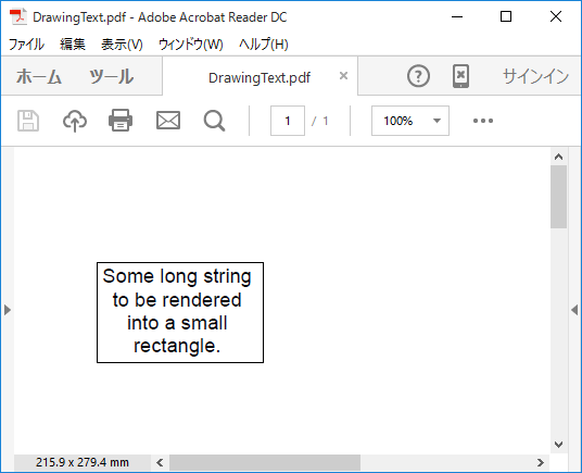 Dim font As New Font("Arial", 12) Dim rect As New Rect(72, 72, 100, 50) Dim text As String = "Some long string to be rendered into a small rectangle. " text = Convert.ToString(Convert.ToString(Convert.ToString(Convert.ToString(text & text) & text) & text) & text) & text ' 文字列を中央揃えにします。 Dim sf As New StringFormat() sf.Alignment = HorizontalAlignment.Center sf.LineAlignment = VerticalAlignment.Center pdf.DrawString(text, font, Windows.UI.Colors.Black, rect, sf) pdf.DrawRectangle(Windows.UI.Colors.Gray, rect) |