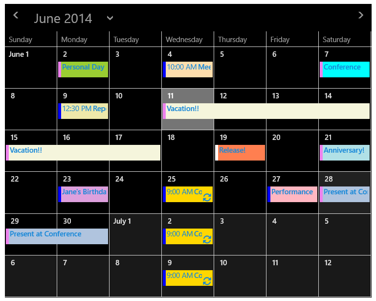 12 個の定義済みのラベルを使用するか、リストに独自のラベルを追加して、各予定にラベルを付けることができます。予定のタイプが一目でわかるように、予定がラベルで色分けされます。ラベルは、どのデータビューにも表示されます。