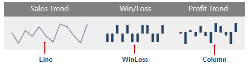 C1Sparkline コントロールを使用すると、データに並べて、簡潔で公正なデータ分析を表示することができます。3つのタイプの C1Sparkline があるため、さまざまなタイプのデータを柔軟にグラフィカル表示することができます。次の図は、この3つのタイプの C1Sparkline コントロールを示しています。