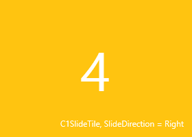 <Tile:C1SlideTile Content="4" Header="C1SlideTile, SlideDirection = Right" Padding="0" SlideDirection="Right" HorizontalHeaderAlignment="Right" Background="#FFC410" Foreground="White" FontSize="80" HeaderForeground="White" HeaderFontSize="12" Width="280" Height="200"/> |