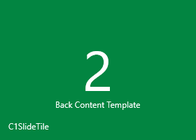 <Tile:C1SlideTile Content="2" HeaderPadding="12" HorizontalContentAlignment="Stretch" VerticalContentAlignment="Stretch" Padding="0" Header="C1SlideTile" Foreground="White" FontSize="80" HeaderForeground="White" HeaderFontSize="12" Width="280" Height="200"> <Tile:C1Tile.ContentTemplate> <DataTemplate> <Border Background="#FFBC1C48" > <TextBlock Text="{Binding}" VerticalAlignment="Center" HorizontalAlignment="Center" /> </Border> </DataTemplate> </Tile:C1Tile.ContentTemplate> <Tile:C1Tile.BackContentTemplate> <DataTemplate> <Border Background="#FF028541" > <StackPanel VerticalAlignment="Center" HorizontalAlignment="Center"> <TextBlock Text="{Binding}" Foreground="White" HorizontalAlignment="Center"/> <TextBlock Text="Back Content Template" Margin="0 -10 0 0" FontSize="12" Foreground="White" HorizontalAlignment="Center"/> </StackPanel> </Border> </DataTemplate> </Tile:C1Tile.BackContentTemplate> </Tile:C1SlideTile> |