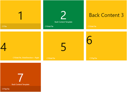 上の図の緑色の C1SlideTile は、ContentTemplate を使用して表示されます。オレンジ色の C1FlipTile は、BackContentTemplate を使用して表示されます。