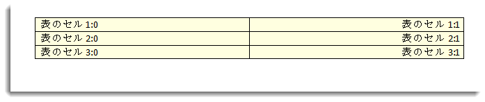 // 表を追加します word.LineBreak(); int rows = 4; int cols = 2; RtfTable table = new RtfTable(rows, cols); word.Add(table); table.Rows[0].Cells[0].SetMerged(1, 2); for (int row = 0; row < rows; row++) { if (row == 0) { table.Rows[row].Height = 50; } for (int col = 0; col < cols; col++) { if (row == 0 && col == 0) { text = Strings.DocumentBasicText2; table.Rows[row].Cells[col].Alignment = ContentAlignment.MiddleCenter; table.Rows[row].Cells[col].BackFilling = Colors.LightPink; } else { text = string.Format("表のセル{0}:{1}", row, col); table.Rows[row].Cells[col].BackFilling = Colors.LightYellow; } table.Rows[row].Cells[col].Content.Add(new RtfString(text)); table.Rows[row].Cells[col].BottomBorderWidth = 2; table.Rows[row].Cells[col].TopBorderWidth = 2; table.Rows[row].Cells[col].LeftBorderWidth = 2; table.Rows[row].Cells[col].RightBorderWidth = 2; if (col == cols - 1) { table.Rows[row].Cells[col].Alignment = ContentAlignment.BottomRight; } } }