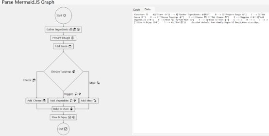 // Read text from the file var text = File.ReadAllText(@"Resources\pizza.txt"); // Load Mermaid.js graph to the diagram // https://mermaid.js.org/syntax/flowchart.html diagram.LoadMermaidGraph(text); |