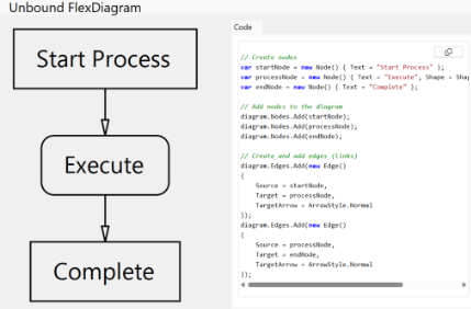 An unbound diagram in FlexDiagram is created programmatically without data binding. You can define and add each node and edge along with their properties and relationships. This method enables full control over layout and appearance, making it suitable for simple static diagrams or custom flowcharts with precise configurations.