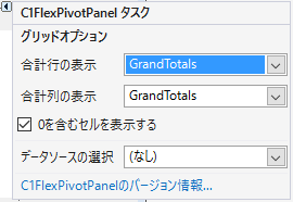 C1FlexPivotPanel コントロールは、よく使用されるプロパティやタスクにアクセスするために、Visual Studio でスマートタグを提供しています。FlexPivotPanel のスマートタグは、コントロールがデータソースに連結されると表示されます。