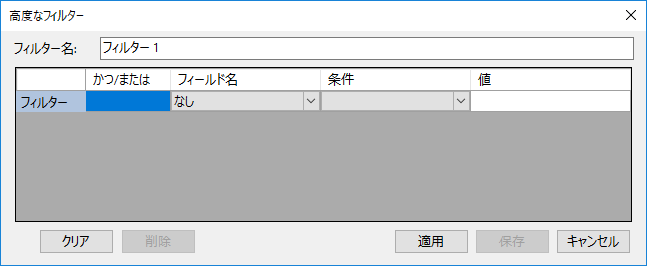 このダイアログは、ツールバーの[フィルタ]ボタンから[詳細フィルタ]オプションを選択すると表示されます。