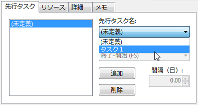 - 先行タスク名 のドロップダウン矢印をクリックし、先行タスク、たとえば タスク1 を選択します。