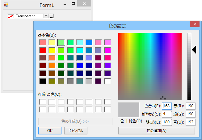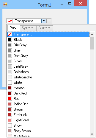 C1ColorPicker コントロールは、詳細なカスタマイズが可能な完全な色選択コントロールです。次の図は、C1ColorPicker にあるドロップダウンボタンをクリックしたときのコントロールのインタフェースです。