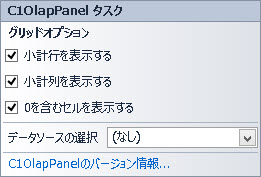 )を使用できます。スマートタグは、C1OlapPanel で最もよく使用されるプロパティを提供するショートカットタスクメニューです。C1OlapPanel スマートタグと [タスク]メニューが表示されるのは、コントロールがデータソースに連結されている場合だけです。