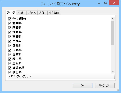 テーブルに表示するフィールドを選択したら、ウィンドウの下部にある[テキストフィルタ]または[数値フィルタ]ボタンをクリックして、範囲フィルタを指定できます。