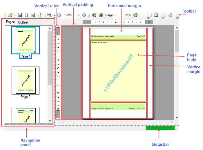 The PrintPreview control is an integrated document viewer control with toolbar, viewer pane, navigation panels and status bar. This previewing control can be used to generate and view reports, or view previously saved ComponentOne documents (.c1d, .c1dx, .c1mdx, .c1db).