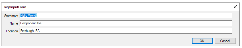 By default, the ShowTagsInputDialog property is False and the Tags dialog box is not displayed. To allow the user to input all tags, each time a C1PrintDocument is generated, set the ShowTagsInputDialog property to True. Any tag you've added to the document's Tags collection will then be automatically presented in a dialog box to the user each time the document is about to be generated. This will give the end-user the opportunity to edit the tags values in the Tags dialog box.