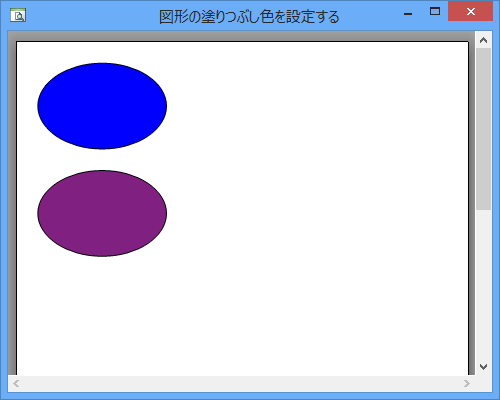 ' 図形の塗りつぶし色を色の名前で設定します。 ellipses(0).Style.ShapeFillColor = Color.Blue ' 図形の塗りつぶし色をRGB形式で設定します。 ellipses(1).Style.ShapeFillColor = Color.FromArgb(&H80, &H20, &H80) |