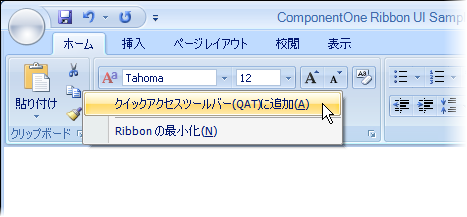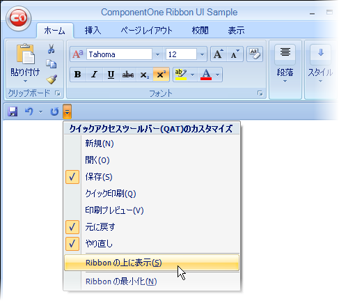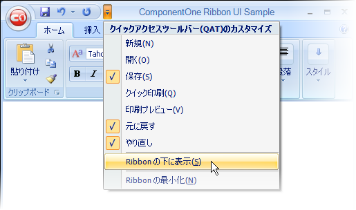 実行時のクイックアクセスツールバー(QAT)のカスタマイズは簡単です。1回のマウスクリックだけで、QAT に項目を追加したり、QAT の位置をリボンの上または下に移動したりできます。