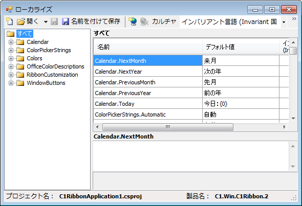 実行時のリソース文字列をユーザーが定義した文字列でローカライズすることが可能になりました。リソースファイル(拡張子 .resx)は各カルチャに対して 1 つずつ作成され、リソースファイルの一式を C1RibbonForm アセンブリに対して適用できます。C1Ribbon とC1StatusBar コントロールのコンテキストメニュー、もしくはプロパティウィンドウのコマンドで「ローカライズ」を選択することで、新しい設計時エディタを起動してリソースファイルの生成を行うことができます。