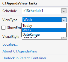 If C1AgendaView is docked in the parent container, the option to undock C1AgendaView from the parent container is available. Clicking Undock in Parent Container sets the Dock property for C1AgendaView to None.