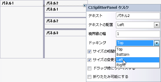 - C1SplitContainer1 の Panel 2 を選択し、Dock プロパティを Left に設定します。
