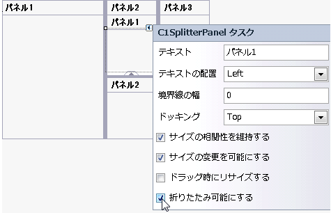 - C1SplitContainer2 Panel1 のスマートタグを選択し、[Collapsible]を ON にします。