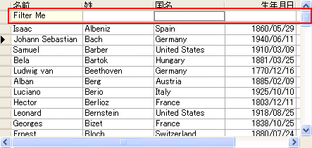 ' 最初の列の C1DataColumn.FilterWatermark プロパティを設定します。 Me.C1TrueDBGrid1.Columns(0).FilterWatermark = "Filter Me" |