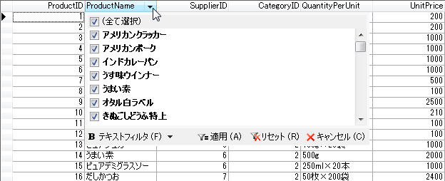 ' フィルタバーを表示しません。 Me.C1TrueDBGrid1.FilterBar = False ' 最初の列を複数の項目でフィルタできるようにします。 Me.C1TrueDBGrid1.Columns(1).FilterDropDown = True |
