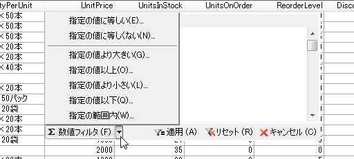 データフィルタリング機能は C1FlexGrid で使用されるパターンに従います。ユーザーが列ヘッダの上にマウスポインタを置くと、グリッドはヘッダー上にフィルタアイコンを表示します。アイコンをクリックするとフィルタエディタが起動します。ここで、表示するデータを指定します。すべての列にはフィルタが設けられ、行は表示のためにすべてのフィルタを通過する必要があります。