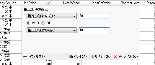 組み込みフィルタには、ユーザーが表示用に特定の値を選択できる値フィルタとユーザーが「指定の値より大きい」、「指定の値で始まる」、「指定の値を含む」といった演算子を使用して最大2つの条件を指定できる条件フィルタがあります。このタイプのフィルタは、数値または日付/時刻値など、「連続する」値を含む列のフィルタリングに適しています。