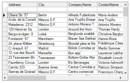 int colcount; colcount = 0; while (c1TrueDBGrid1.Columns.Count > colcount) { // 各列のC1DataColumn.FilterWatermarkプロパティをそのキャプションに設定します。 this.c1TrueDBGrid1.Columns[colcount].FilterWatermark = c1TrueDBGrid1.Columns[colcount].Caption; colcount = colcount + 1; } |