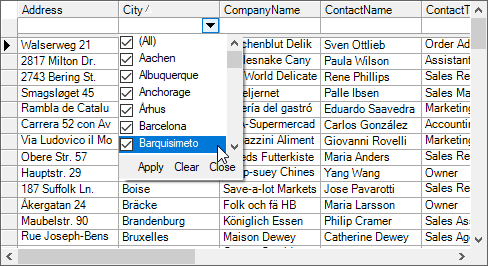 実行時に、複数のフィルタ条件を使用してグリッドをフィルタできるようになりました。たとえば、文字 A または文字 B で始まる項目だけがグリッドに表示されるグリッドをフィルタできます(フィルタをどちらか1つの条件に限る必要はありません)。必要な手順は、FilterMultiSelect プロパティを True に設定し、テキストをフィルタバーに表示するだけです。