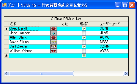 - プログラムを実行し、次の動作を確認します。C1TrueDBGrid1 には、チュートリアル10: セル内ビットマップを使ってユーザーインタフェースを強化すると同じデータが表示されますが、偶数行の背景色は明るいシアンになります。
