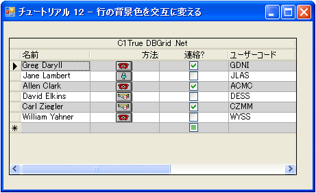 C1TrueDBGrid1 には、前の図と同じデータが表示されますが、偶数行の背景色は明るい灰色に変わっています。