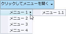 | <Xaml:C1DropDownButton x:Name="ddl" Header="Click Here to open the menu" HorizontalAlignment="Left" Xaml:C1NagScreen.Nag="True" Margin="451,301,0,391" Grid.Row="1"> <Xaml:C1MenuList> <Xaml:C1MenuItem Header="メニュー 1"> <Xaml:C1MenuItem Header="メニュー 1.1" /> </Xaml:C1MenuItem> <Xaml:C1MenuItem Header="メニュー 2" /> <Xaml:C1MenuItem Header="メニュー 3" /> <Xaml:C1MenuItem Header="メニュー 4" /> </Xaml:C1MenuList> </Xaml:C1DropDownButton> |